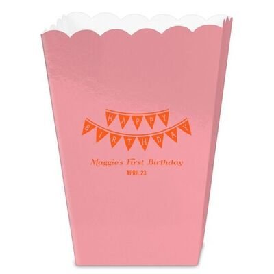 Personalized mini popcorn treat boxes are perfect for treats at your party. Free online preview. Choice of 14 box colors, 40+imprint colors and typestyles. Heavy card stock with a glossy finish.