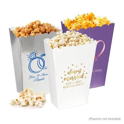 These personalized mini popcorn treat boxes are perfect to serve popcorn or other treats at a candy bar. The boxes have a classic scalloped edge along the top. Personalize the boxes with a wedding design, the couple’s monogram or initials, a short phrase, or the couple’s names and wedding date. Your choice of box color and imprint color. Placement only as shown. Boxes are constructed from heavy cardstock with a glossy finish.