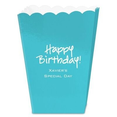 Personalized mini popcorn treat boxes are perfect for treats at your party. Free online preview. Choice of 14 box colors, 40+imprint colors and typestyles. Heavy card stock with a glossy finish.